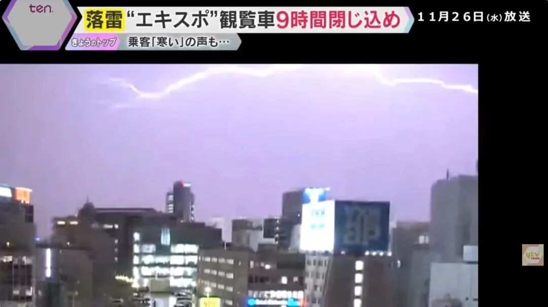 11月25日傍晚,日本大阪府吹田市EXPOCITY综合娱乐设施内的"大阪之轮"摩天轮突发意外,遭强烈雷击后陷入停摆状态,9个座舱内的约20名游客被悬于123米高空。