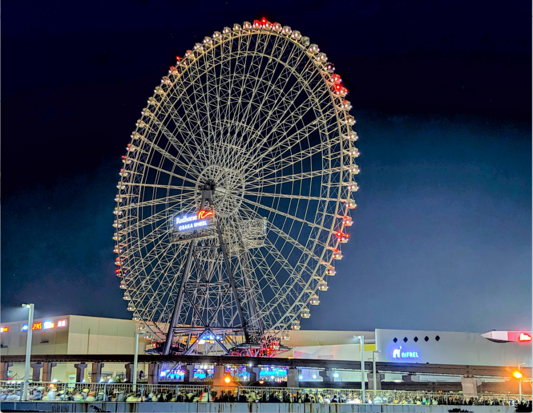 据了解,“大阪之轮”位于吹田市的一购物中心与影院综合体内,被称为全日本最高的摩天轮,高度为123米,转一圈约18分钟。全轮共有72个吊舱,采用透明地板,游客仿佛悬浮半空。