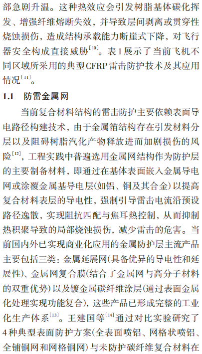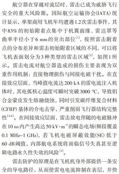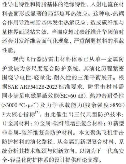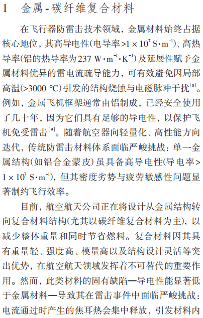 摘要:随着全球航空工业技术的高速发展和航空运输需求的快速增长,现代飞机设计正朝着高性能、高安全性和轻量化的方向不断演进。在此背景下,飞机雷击防护材料研究已成为航空材料科学领域的重要前沿课题。雷电作为自然界中极具破坏力的瞬态放电现象,其瞬间释放的超高电流、电压及电磁脉冲会对飞行中的飞机造成严重威胁。雷击不仅会导致飞机结构产生裂纹、烧蚀等永久性损伤,影响飞行稳定性和安全性,还可能造成机载电子设备故障或误动作,导致导航、通信等关键系统失效,从而危及飞行安全。因此,研发兼具优异导电性能、耐高温特性、高机械强度以及出色雷击损伤耐受能力的高性能防护材料,对提升飞机雷电防护能力和保障航空安全具有重大意义。本文综述了当前主流的飞机雷击防护材料技术体系,分析了金属涂层技术、碳纤维增强聚合物(CFRP)复合材料以及新型纳米材料等关键料的研究进展。最后,展望了该领域的未来发展趋势,以期为飞机雷击防护材料的深入研发提供理论依据和技术参考,助力航空工业安全水平的持续提升。