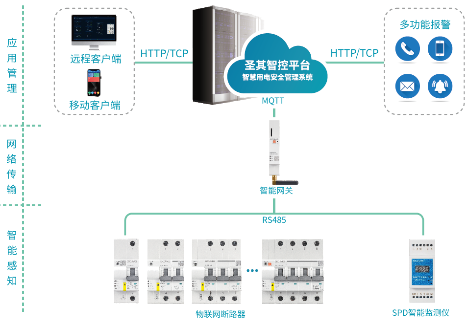 系统核心在于分布轨道式综合用配电安全预警监控装置。它将MQTT智能网关、物联网断路器、SPD智能监测仪三者深度融合,像一个高度集成的“安全哨兵”,直接安装在配电箱/柜内。