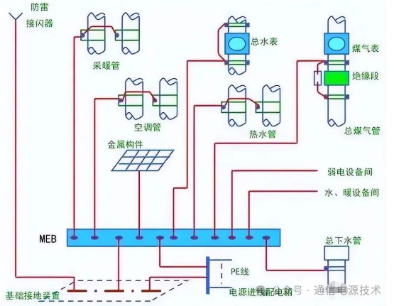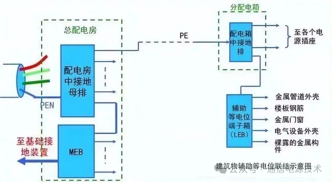 总等电位联结:将建筑物内所有保护接地线(PE、PEN);钢筋混凝土基础;进入大楼的裸露的金属物体:水管、煤气管;空调管道等均联结于同一点:即房屋的接地装置(配电房中的总等电位端子箱—MEB)。