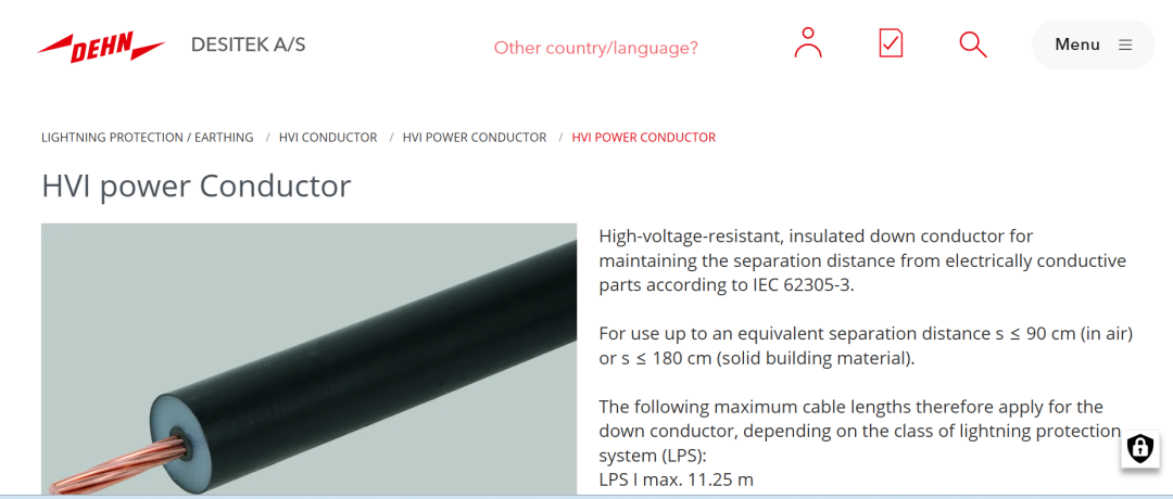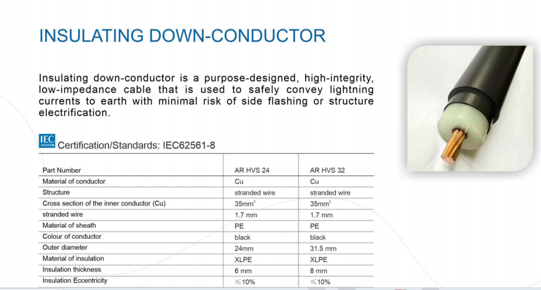 绝缘引下线:IEC 62305-3中更关注“隔离安装”方式,而非导体本身的绝缘层;耐高压型产品(如DEHN HVI)需满足等效空气隔离距离(如≤90 cm)要求。