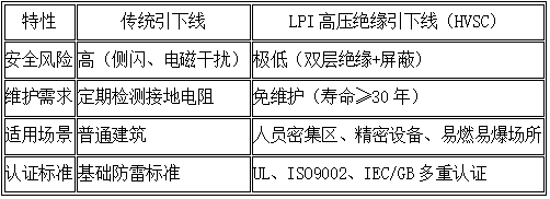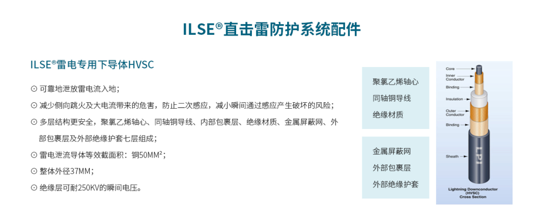 LPI的高压绝缘引下线(HVSC)通过同轴绝缘结构与多重屏蔽设计,解决了传统防雷系统的侧闪隐患,成为高危场景防雷的革新性方案。其技术参数与安全性能至今仍是行业技术标杆,并持续影响现代防雷工程的设计标准。成为绝缘引下线技术的标杆,推动全球防雷标准升级。