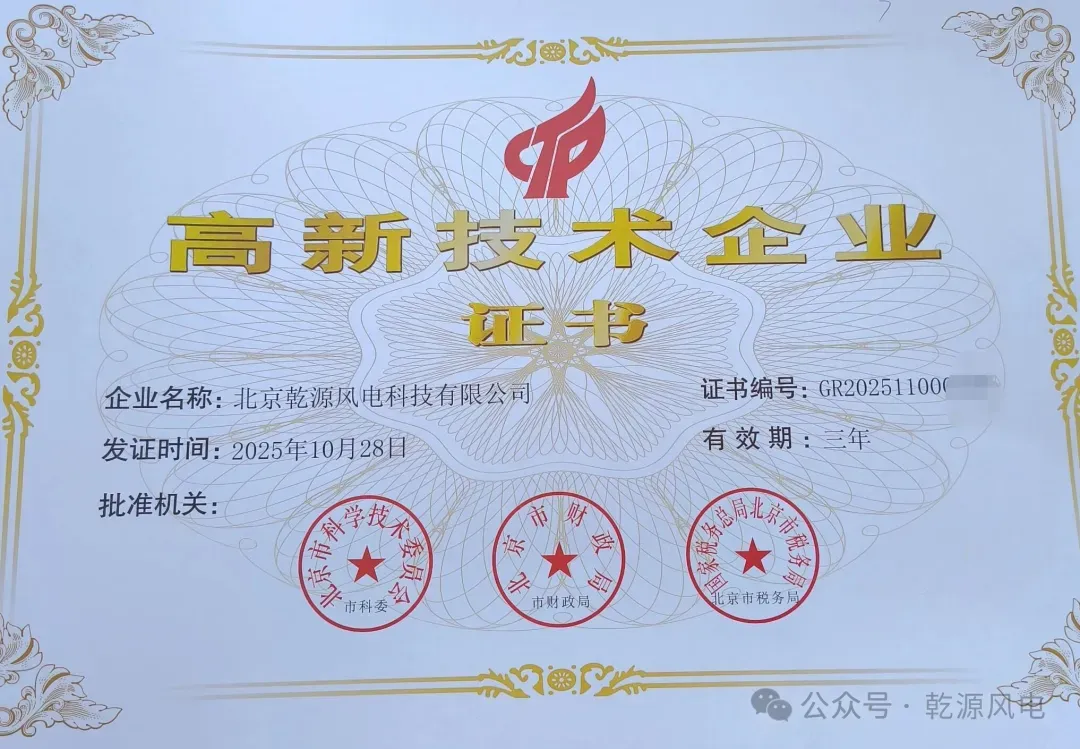 近日,北京乾源风电科技有限公司(以下简称“乾源风电”)正式收到由北京市科学技术委员会、北京市财政局、国家税务总局北京市税务局联合颁发的《高新技术企业证书》,证书编号为GR20251100,发证日期为2025年10月28日,有效期三年。